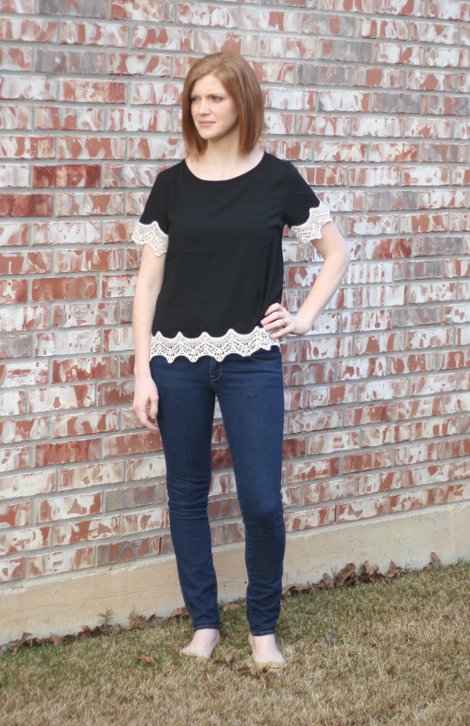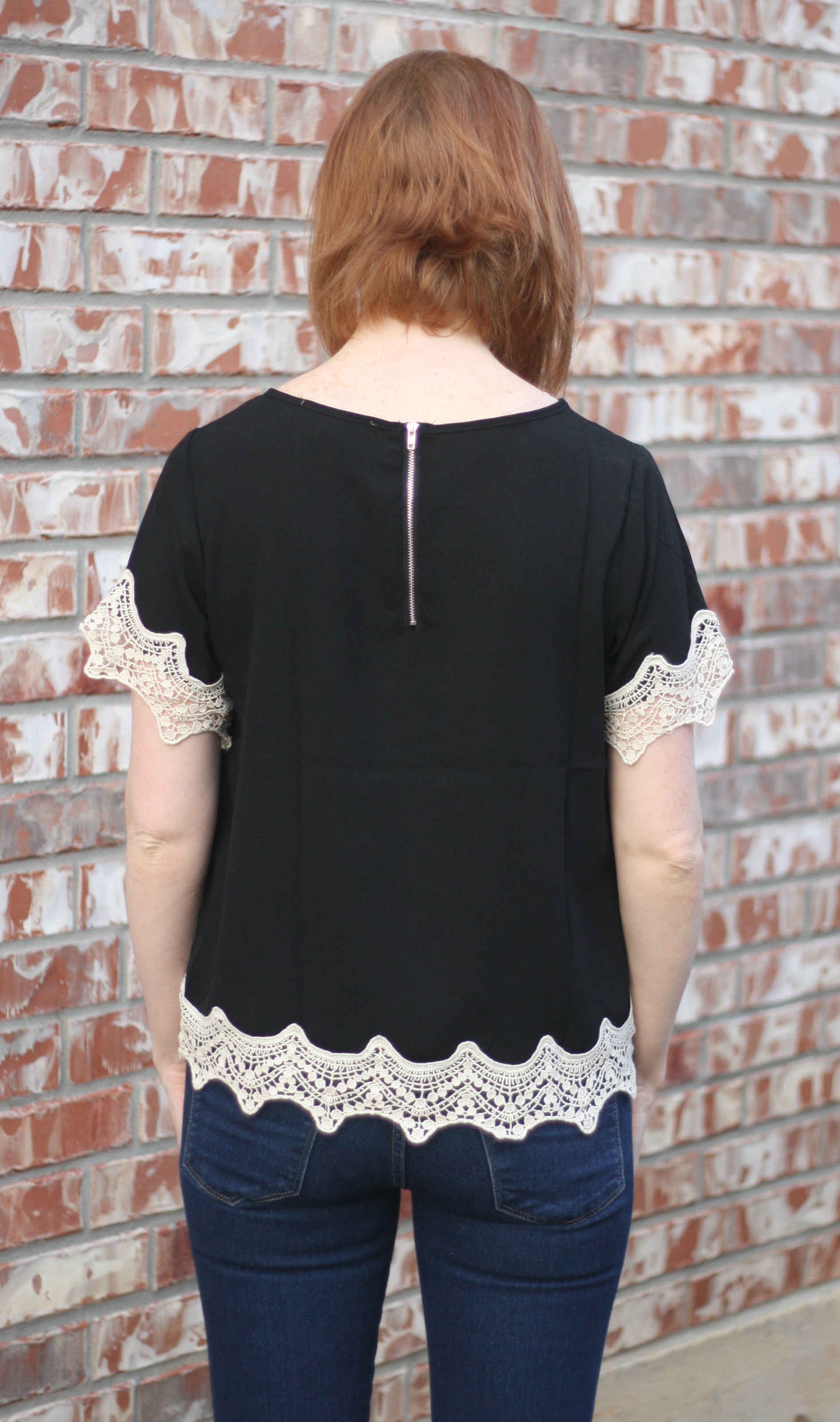 This black top with crochet trim is perfect for everything - wear it to work or dress it up for a night out! Top features zipper back. This top runs small - we recommend sizing up. 97% polyester, 3% spandex.