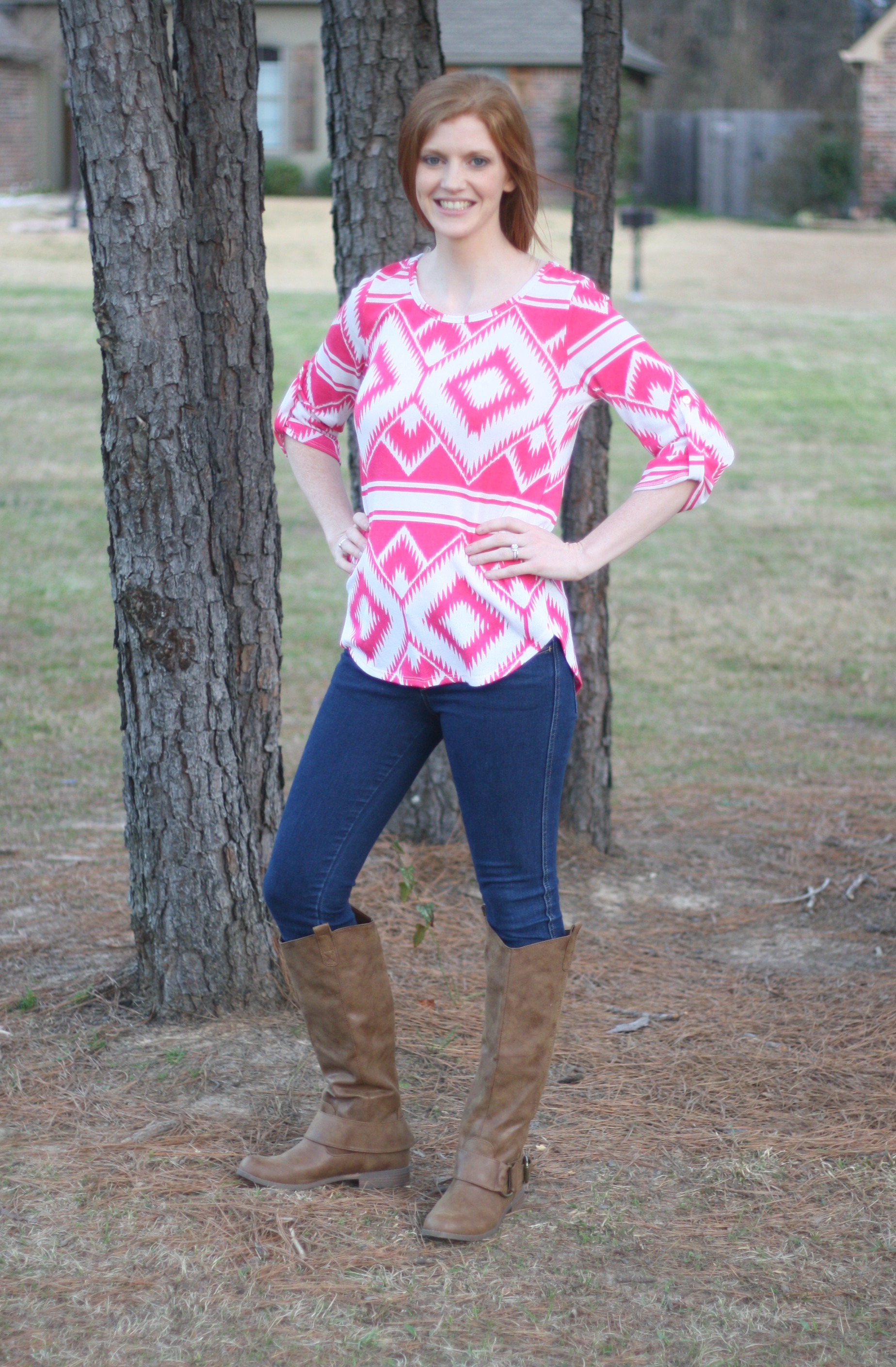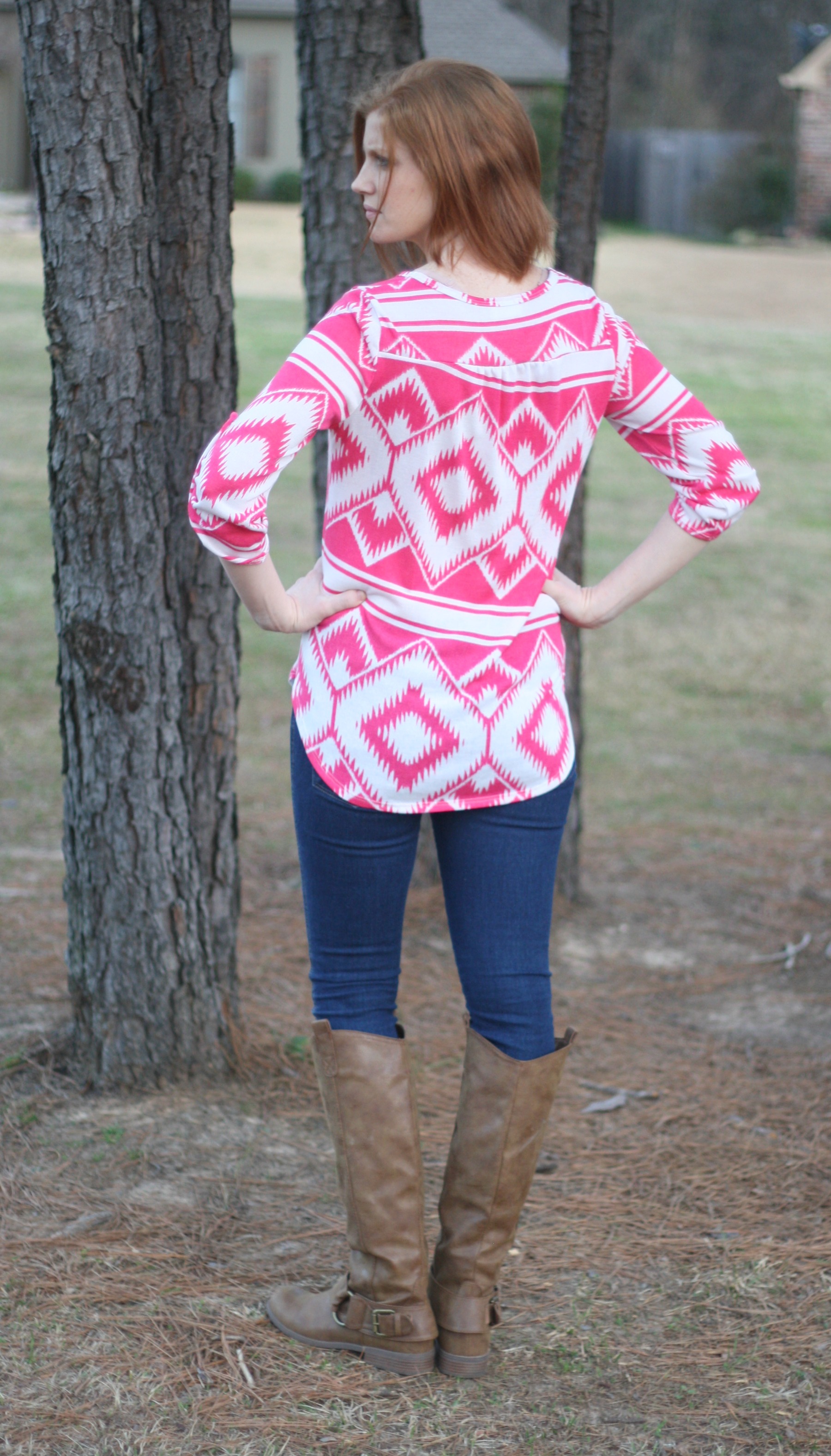 This pink geometric print top is perfect for spring and still light enough to wear through the summer. Top features high low detail and a loose fit. 100% polyester - made in the USA.