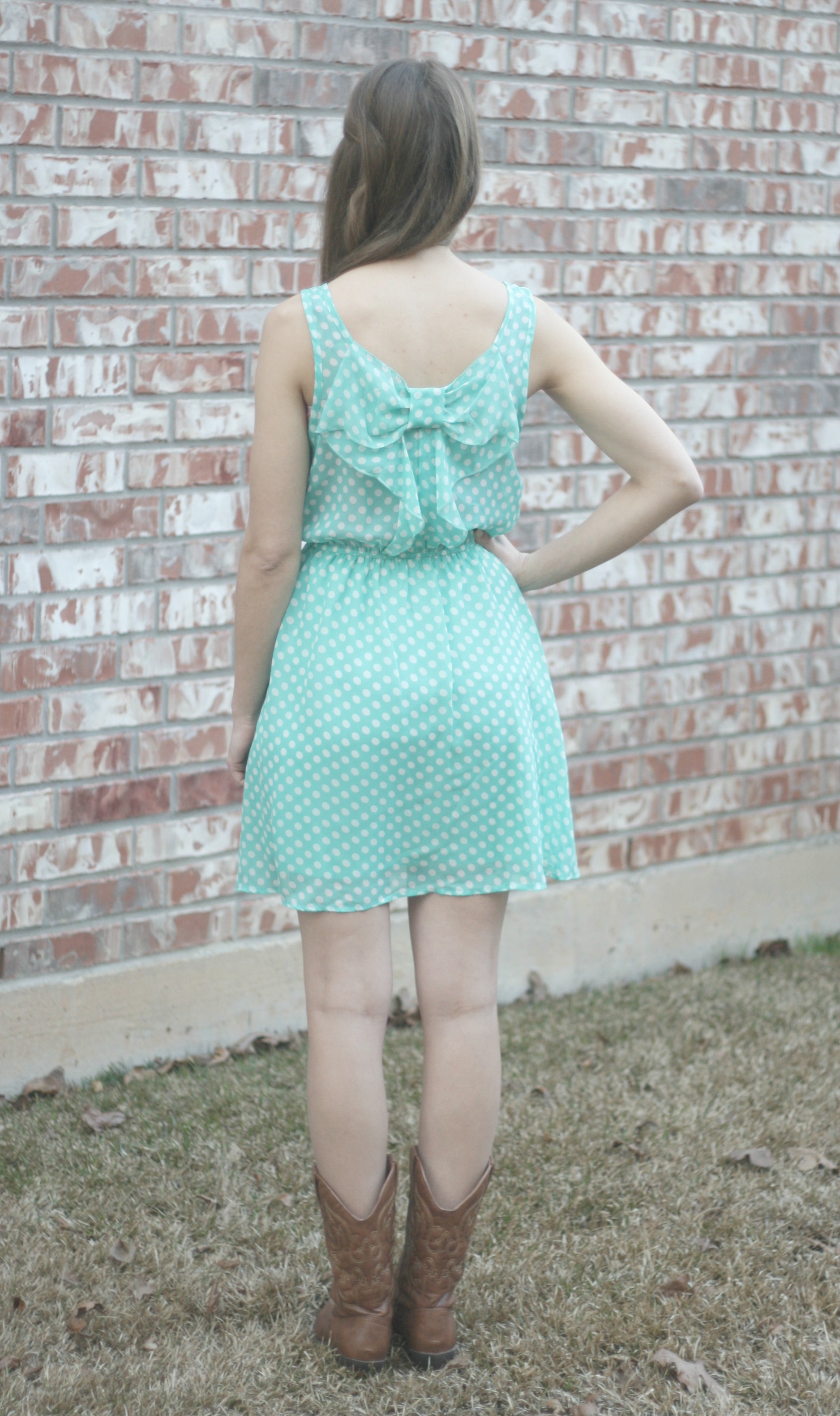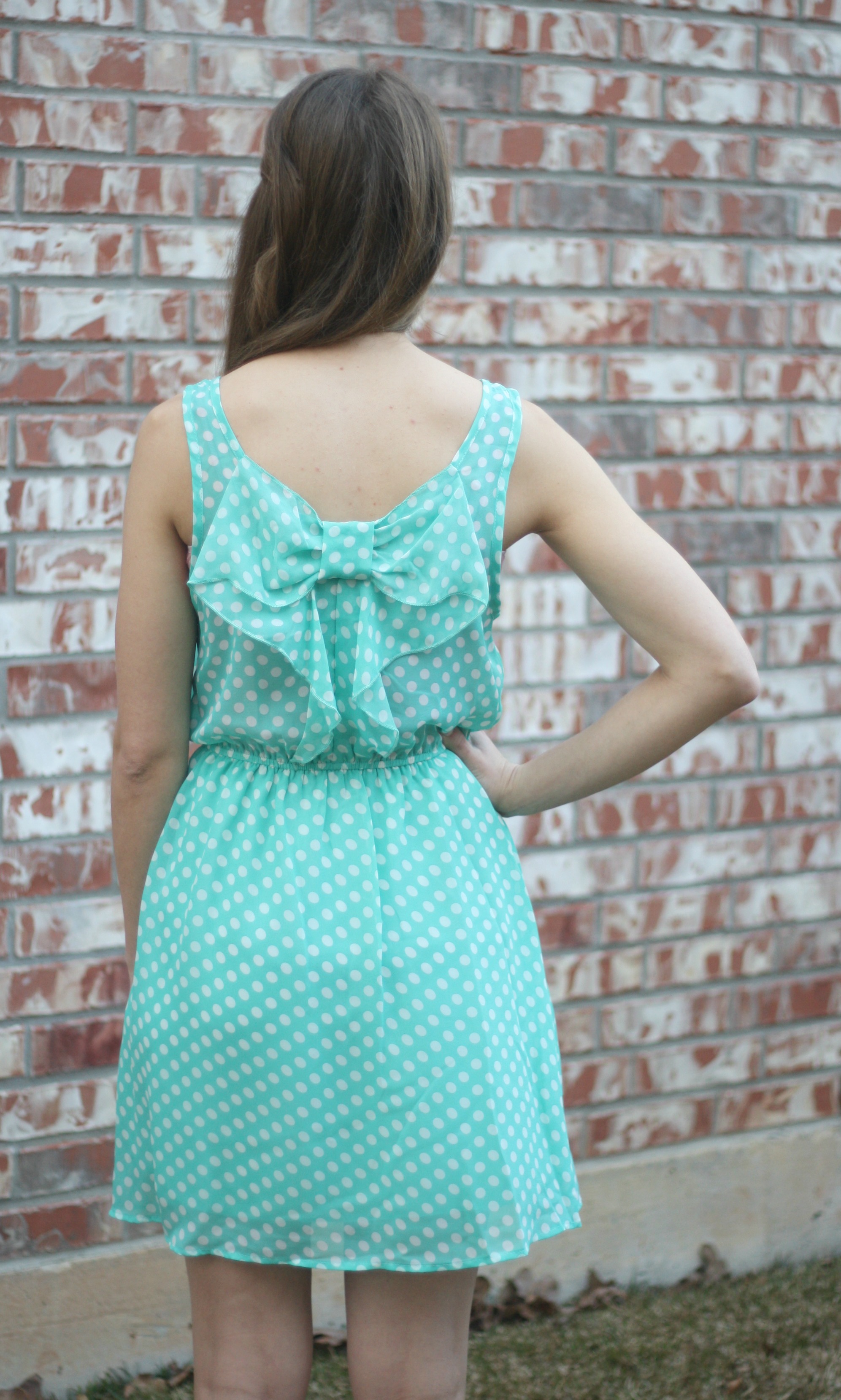 Precious polka dot dress featuring an elastic waistband and bow back detail. Fully lined. 100% polyester - made in the US.