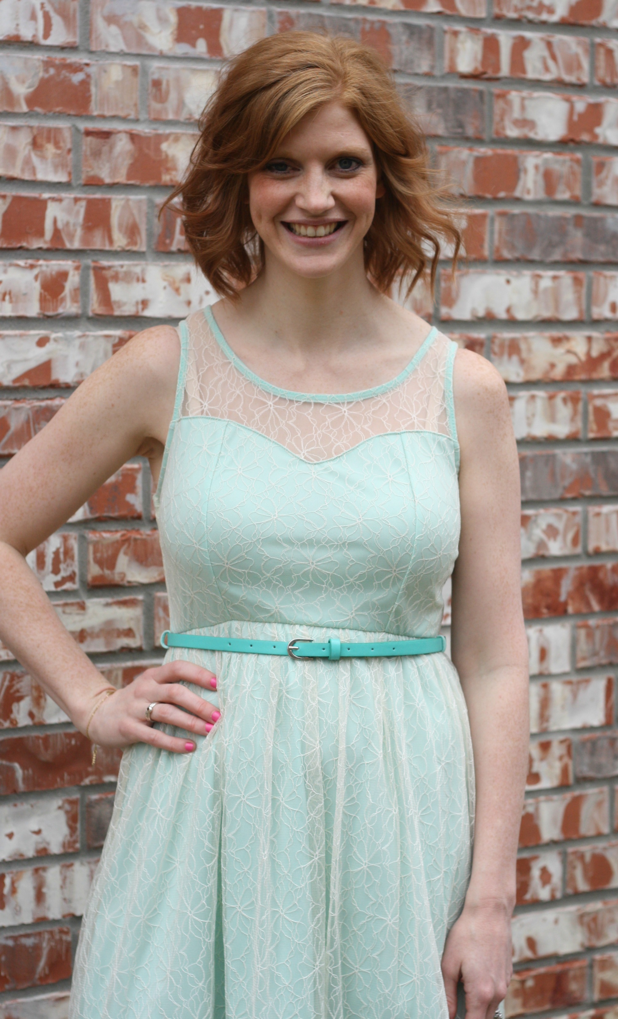 Sweet lace dress in mint with mint skinny belt included. Dress is fully lined with keyhole back. Runs true to size. 100% nylon. Made in the USA.