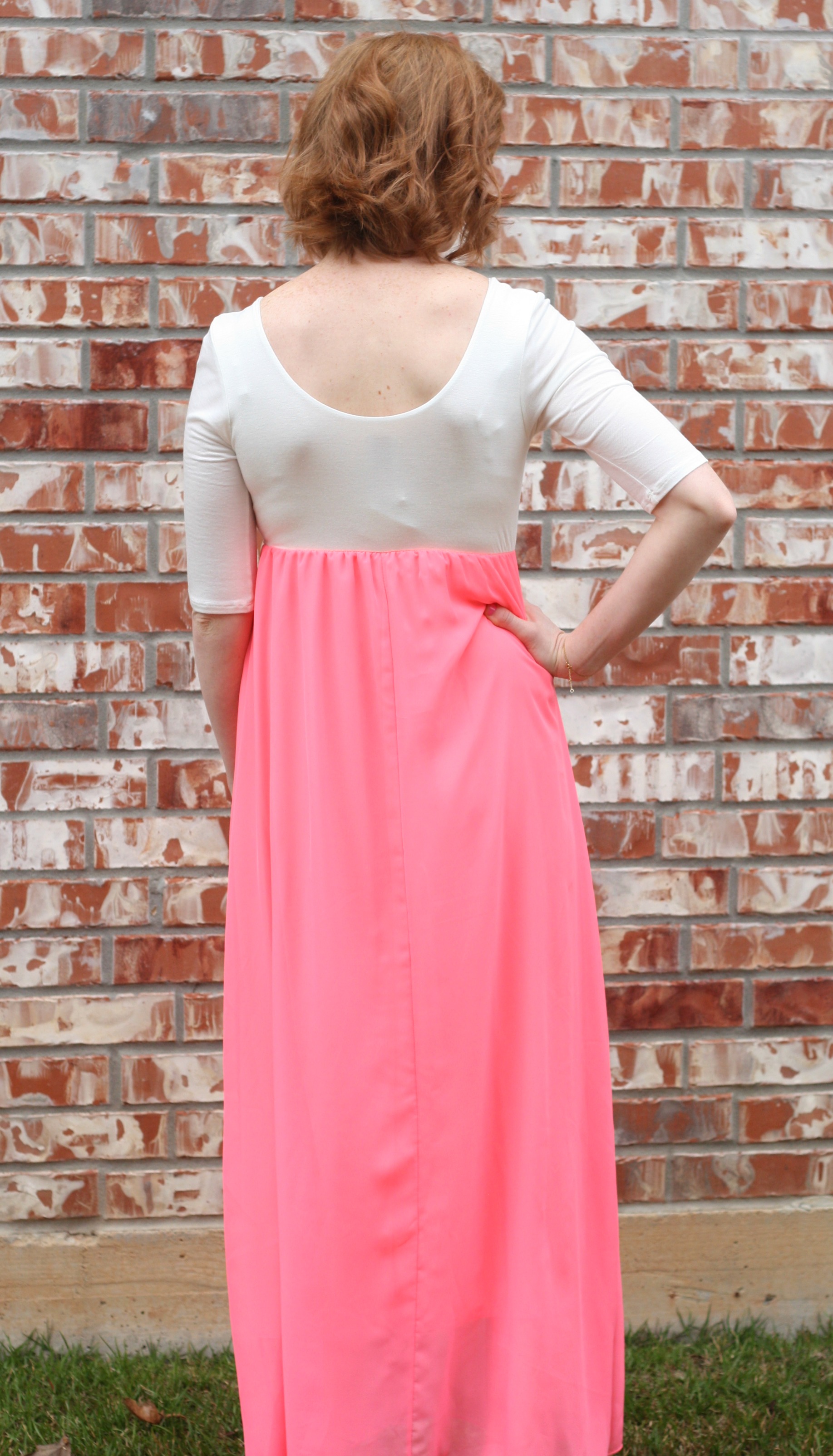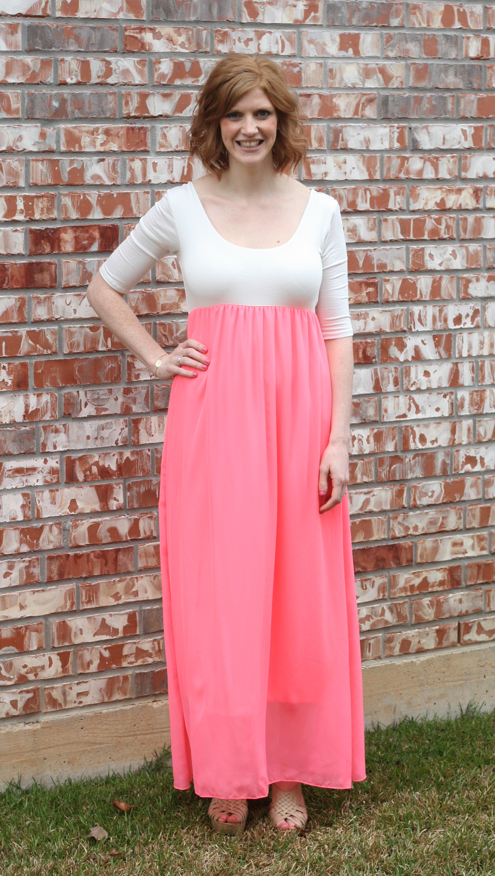 Sweet pink and white maxi dress that's easy to wear with sandals at the beach or dress up for a night out! The top is so soft and the bottom flows beautifully. Top is 95% rayon, 5% spandex. Bottom is 100% polyester. Made in the USA.