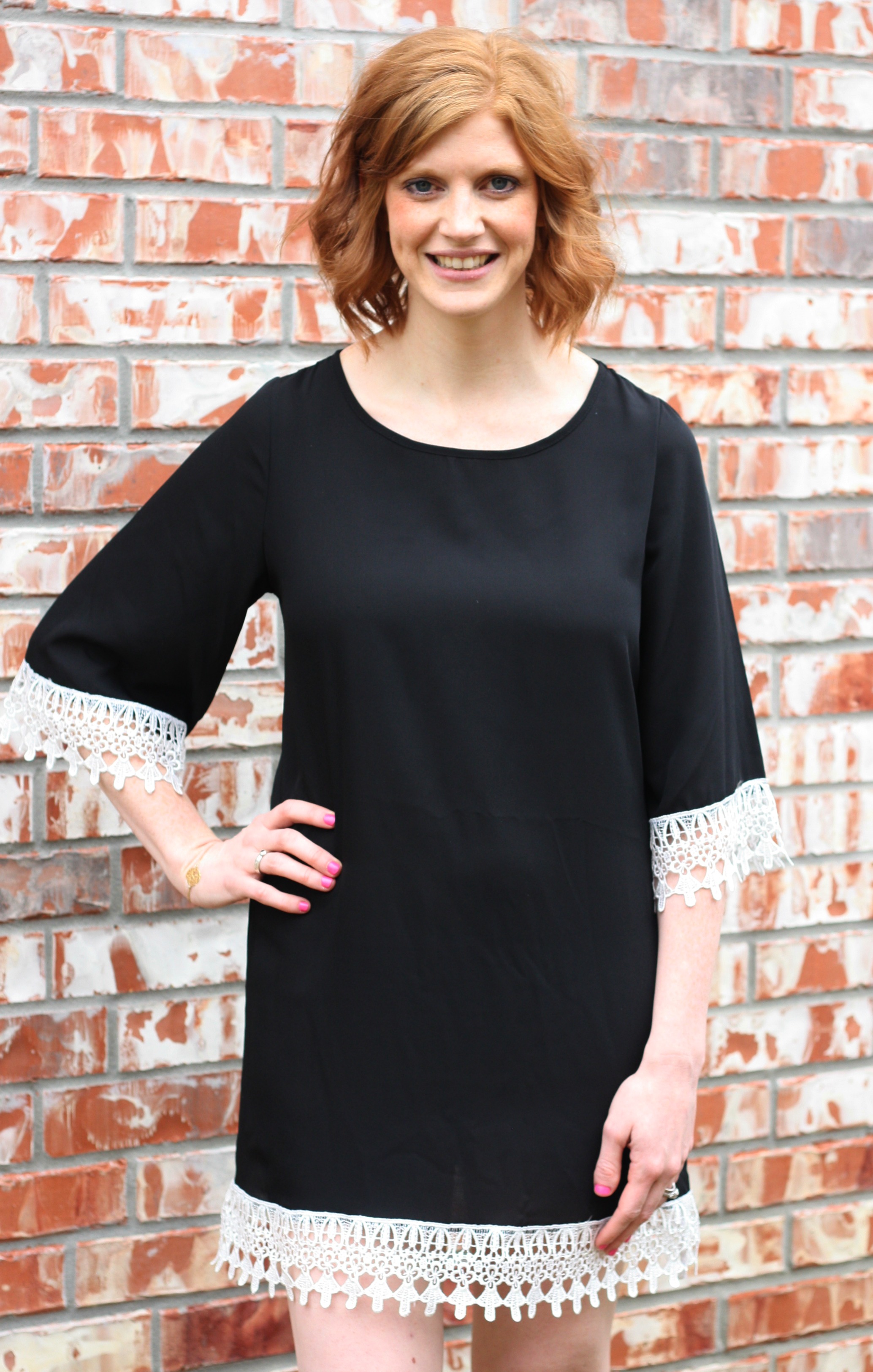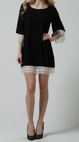 Everyone needs a little black dress and this one will be your favorite! This darling dress features ivory crochet trim and a flattering fit for all body shapes. Fits true to size. 100% polyester. Made in the USA.
