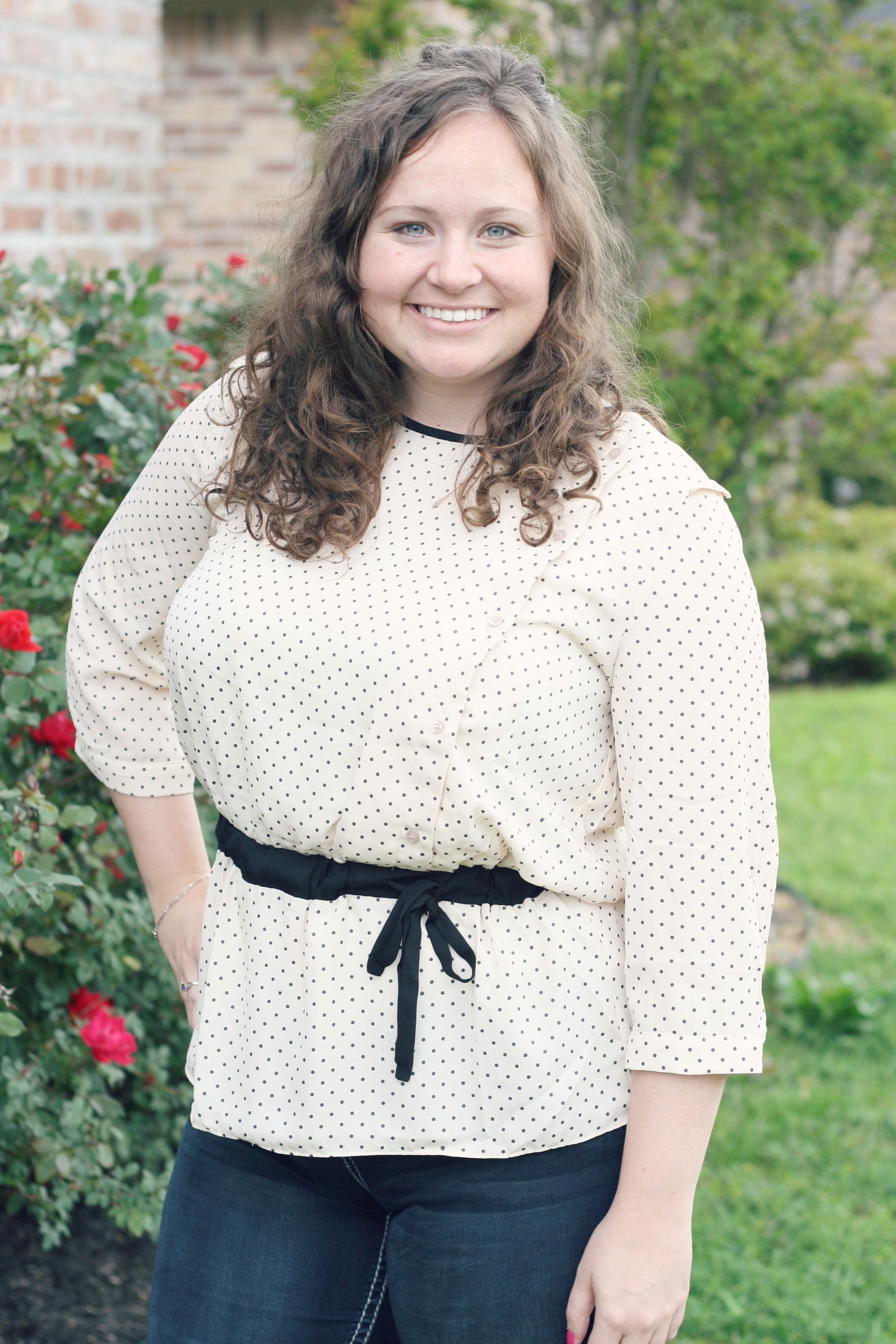 This sweet top is a beautiful cream color with black polka dots. Top is semi-sheer and features side button detailing and a black elastic waist with tie. 100% polyester. Fits true to size to roomy.